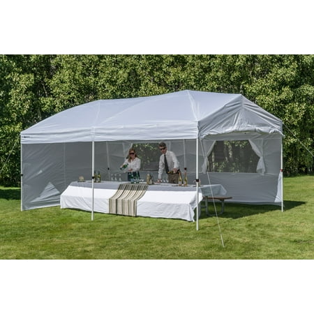 Six walls are included. Four walls have mesh panels with curtains and one of the two end walls rolls up for easy access under the canopy